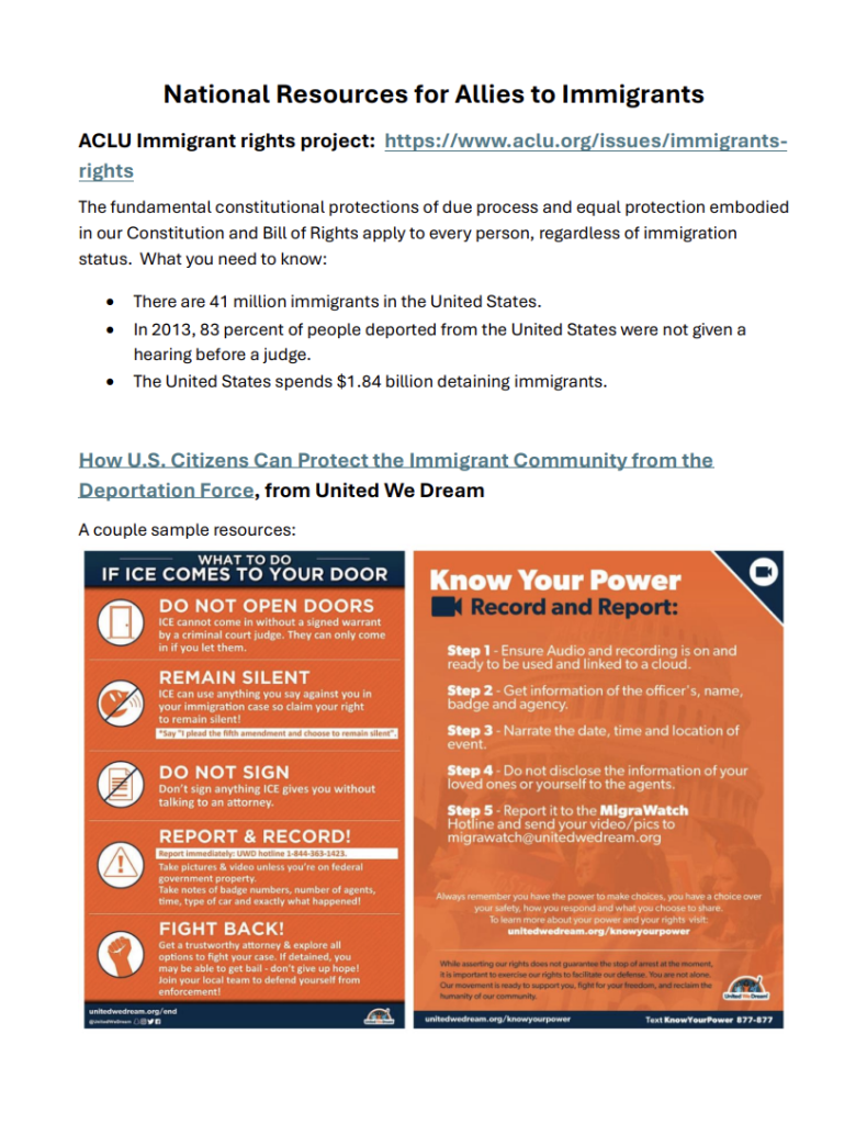 Recursos para quienes apoyan a los inmigrantes, proporcionados por diversas organizaciones, entre ellas la ACLU, United We Dream y Freedom for Immigrants, sobre los derechos de los inmigrantes, cómo los ciudadanos estadounidenses pueden proteger a la comunidad inmigrante, el seguimiento de las políticas de inmigración de Trump y medidas que puedes tomar.
