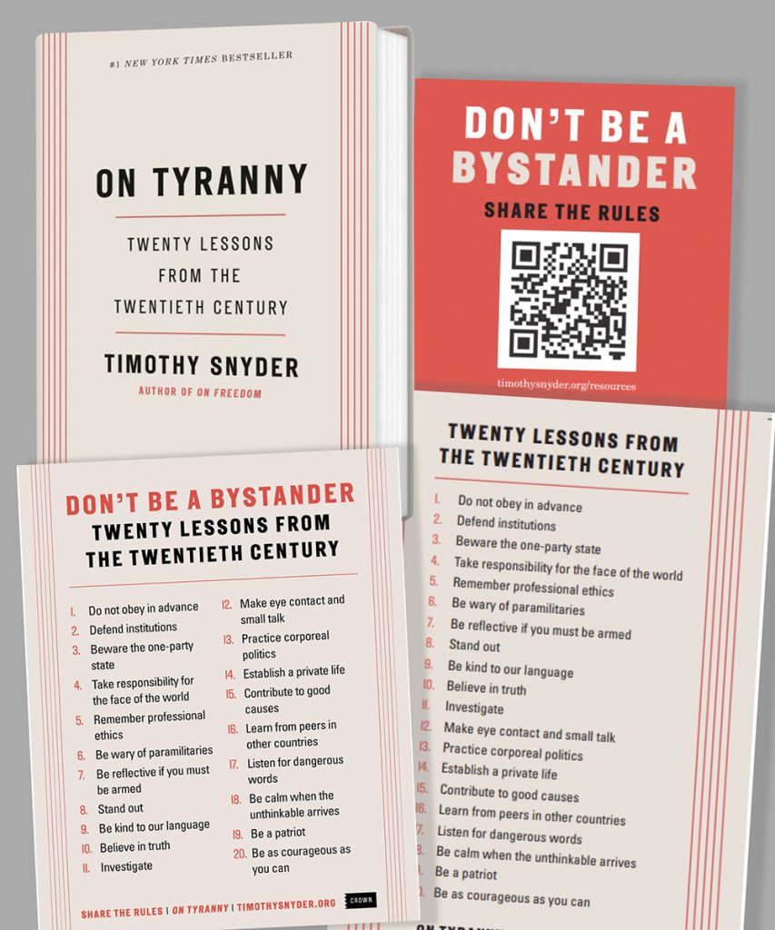 Timothy Snyder ofrece recursos gratuitos de suéxito de ventas número uno , *On Tyranny* —unaguía «estimulante» (Vox)para sobrevivir y resistir al giro de Estados Unidos hacia el autoritarismo—, de «un intelectual público en auge que no teme establecer conexiones audaces entre el pasado y el presente» (The New York Times)