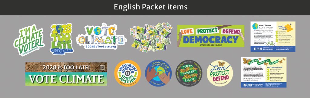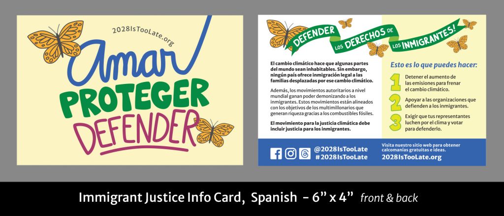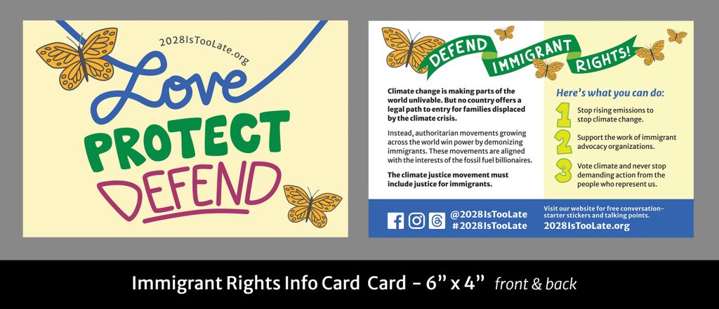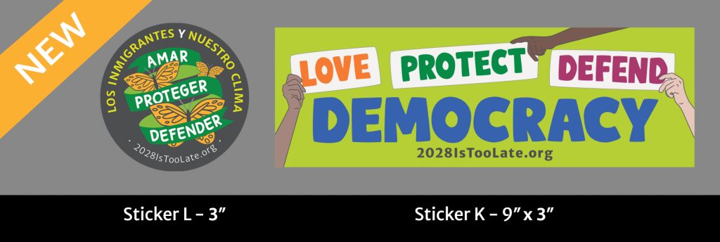 Our stickers connecting Climate Justice with Immigrant Justice and our Love, Protect, Defend Democracy stickers are important as we resist the Trump agenda.