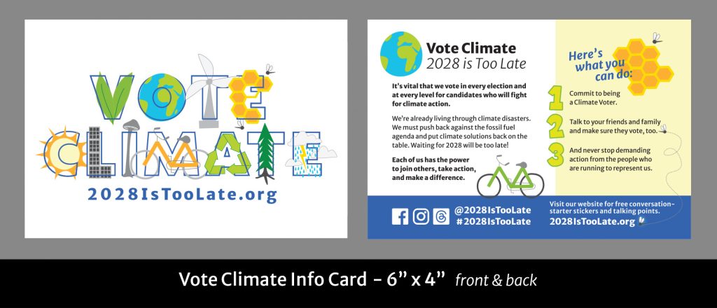 The VOTE CLIMATE stickers were designed to start conversations about the 2024 election. They continue to be useful going forward as we work for state and local climate initiatives.
